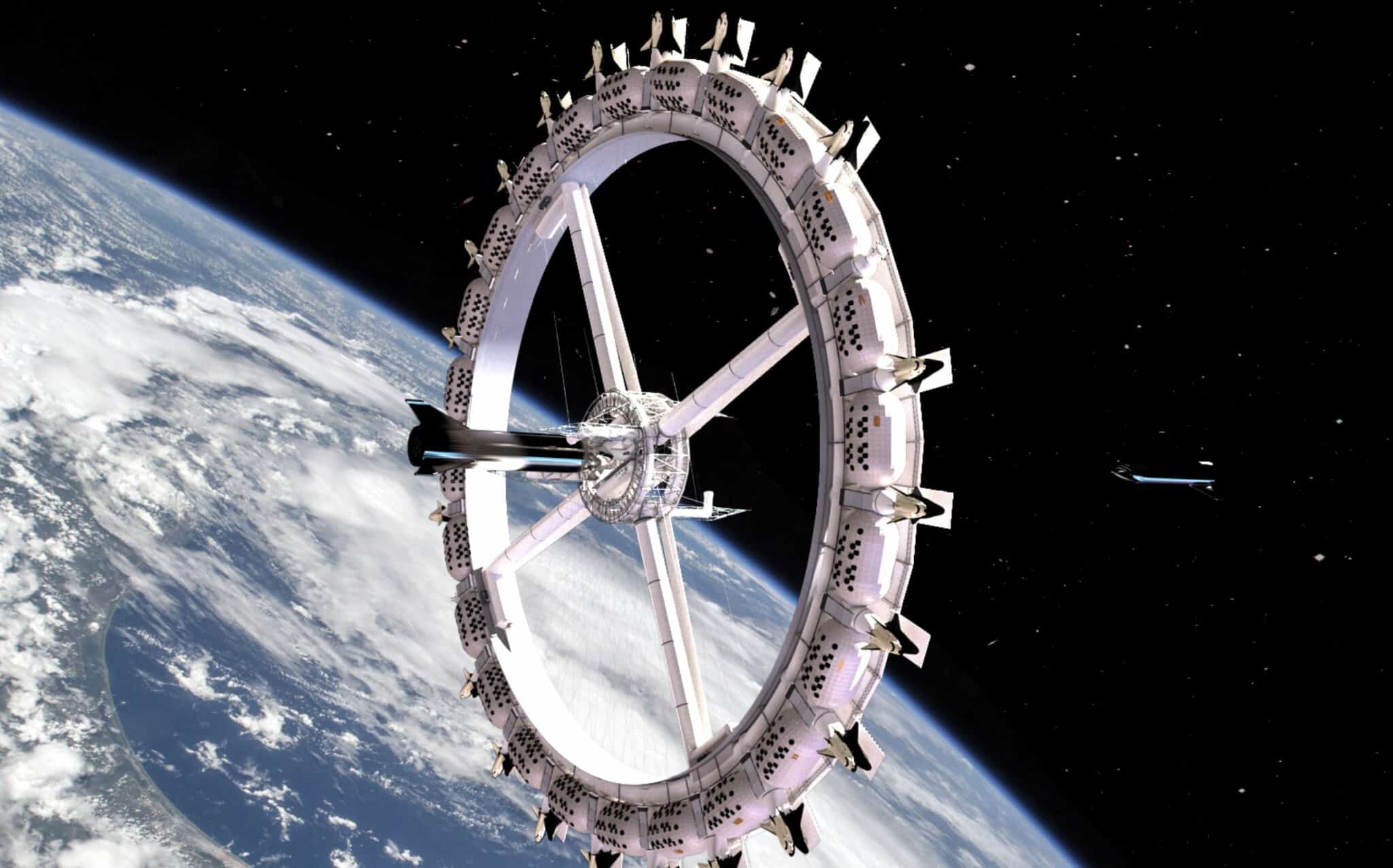 The structure spans 488 meters in diameter and will rotate to simulate one-sixth of Earth's gravity while circumnavigating the planet every 90 minutes. The Voyager Station is designed to accommodate 450 guests and 150 crew members, providing amenities such as restaurants, a sports hall, and a movie theater.