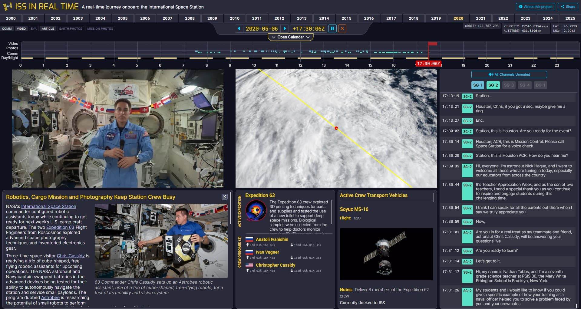The tool enables users to learn about the daily events that occurred on the ISS since continuous human occupancy began on November 2, 2000. Upon selecting a date in the calendar, users can explore activity logs, relevant news, and multimedia content, including videos, photographs, and audiologs, from the onboard crew.