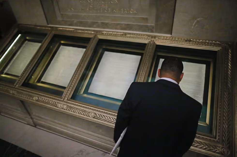 Handwritten in gallnut ink and signed in August 1776, the Declaration endured rough handling, repeated copy attempts, and decades of exposure to air and light—leaving it heavily faded and even marked by a mysterious handprint that appeared in the early 20th century.