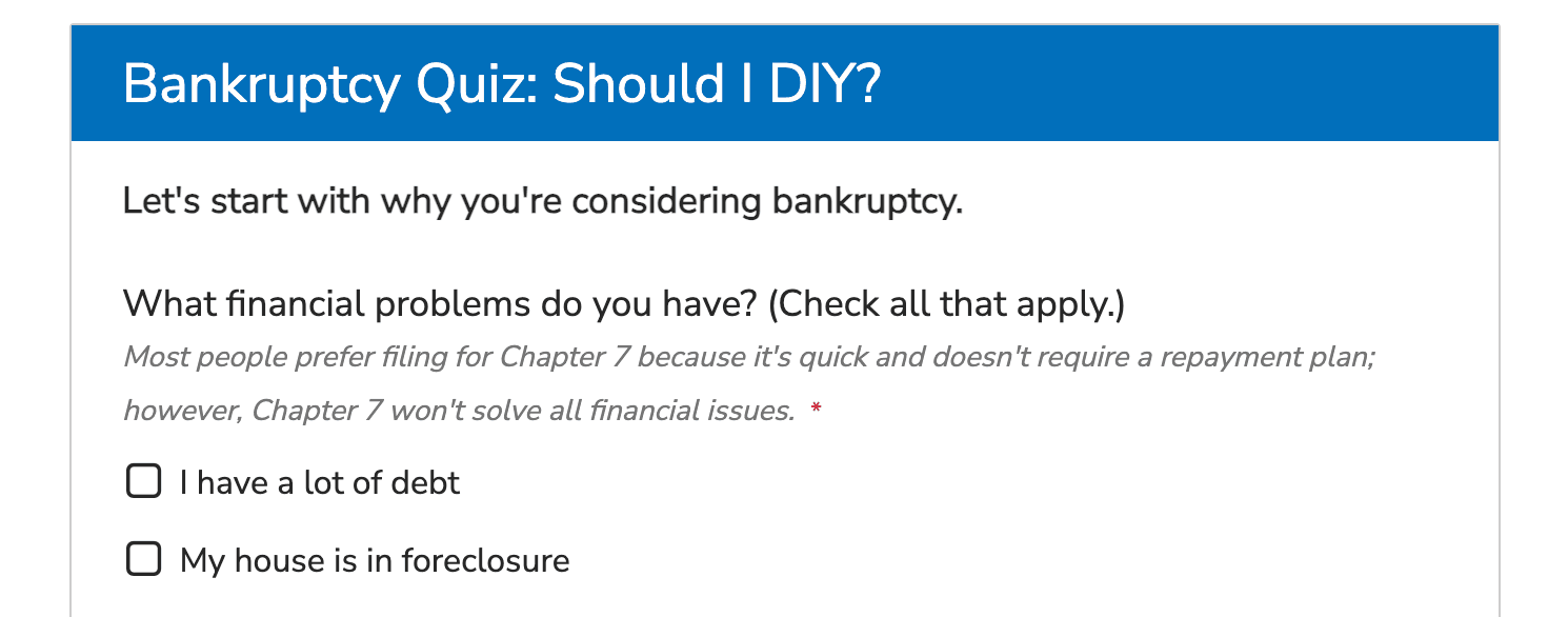 If a debtor is considering filing for Chapter 7 bankruptcy, it may be tempting to take a do-it-yourself approach to avoid attorney or preparer fees. However, experts caution that this could come back to bite filers. A quiz can help would-be filers explore whether their cases are complex enough to necessitate a lawyer.