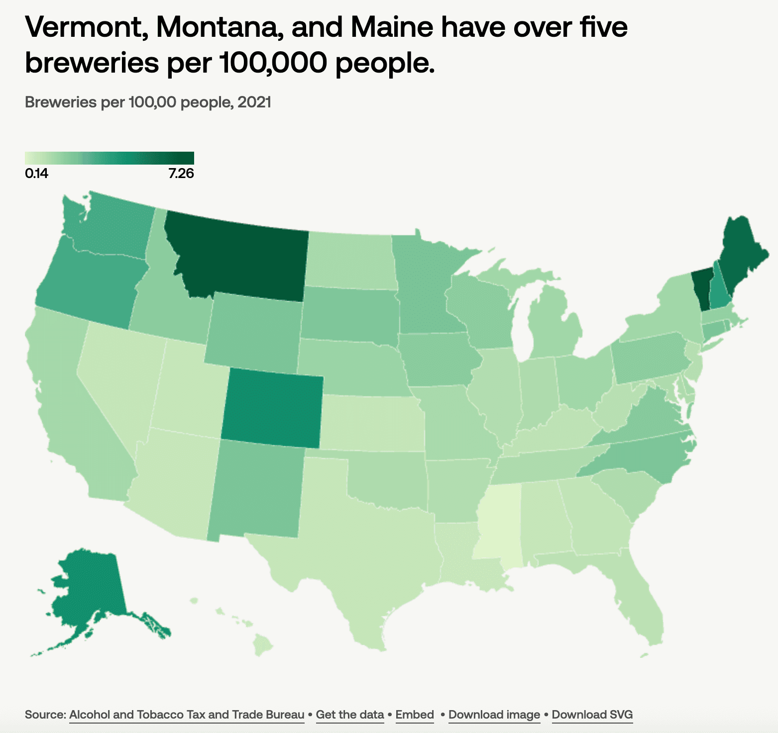This statistics-focused resource breaks down the shape of the beer industry in the US, outlining the amount of beer produced by American breweries, the state cranking out the most beer, and the states with the most breweries per capita.