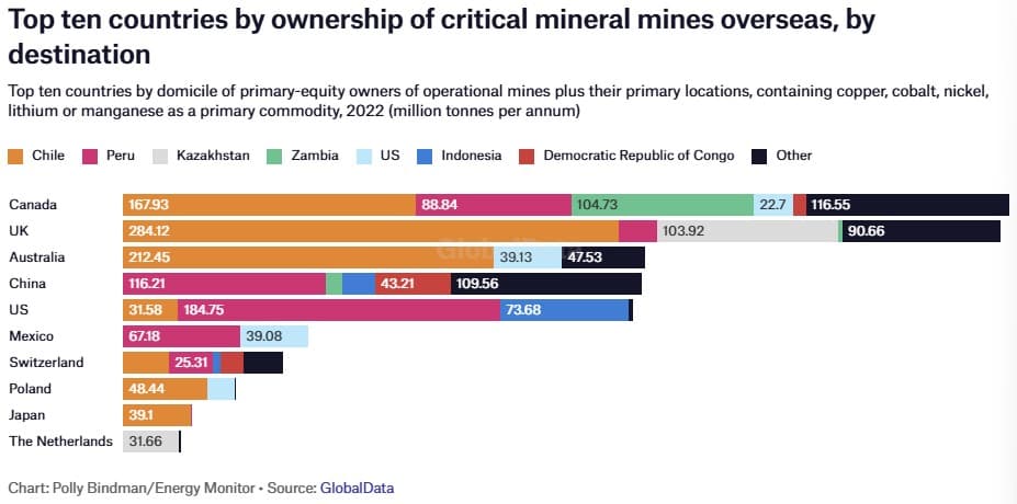 Wealthy nations are tapping into their domestic critical mineral reserves and buying up mines in poorer countries. The US, the UK, Canada, Australia, and China are taking the lead, with Chinese operations spanning all continents except Antarctica.