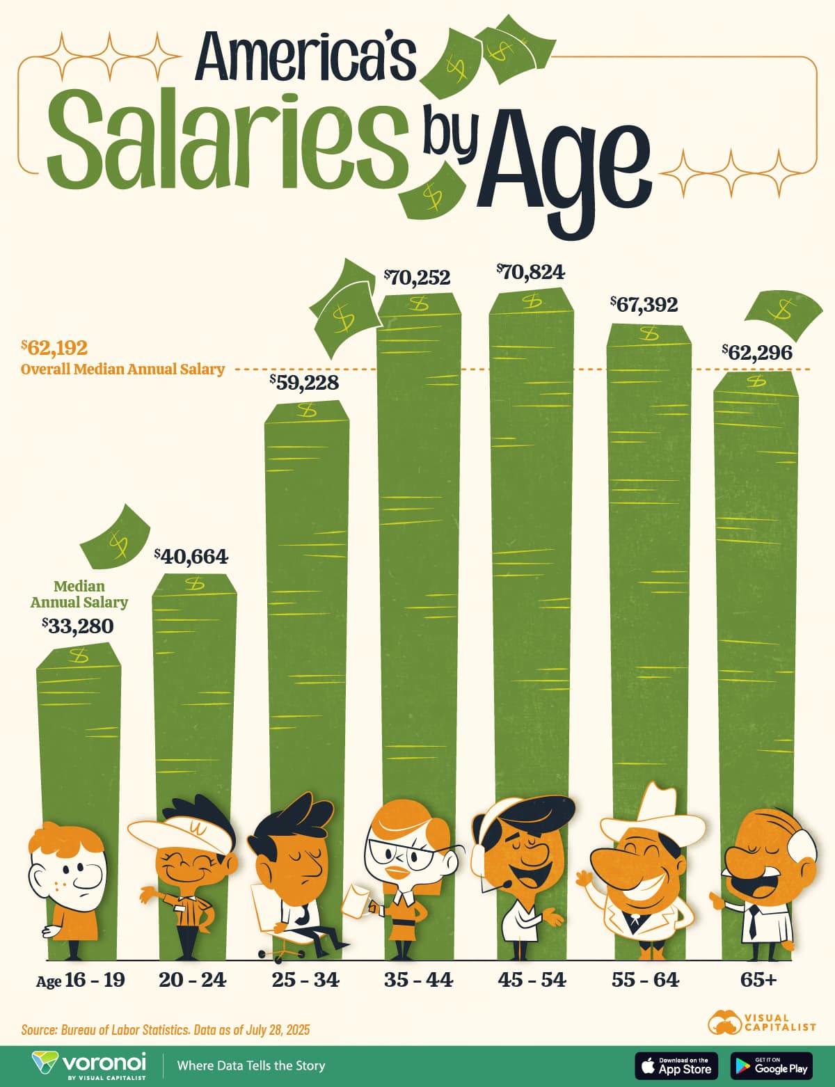 The age group with the highest median annual salary in the US, $70,824, was made up of people ages 45 to 54, according to Bureau of Labor Statistics data from July 28, 2025.
