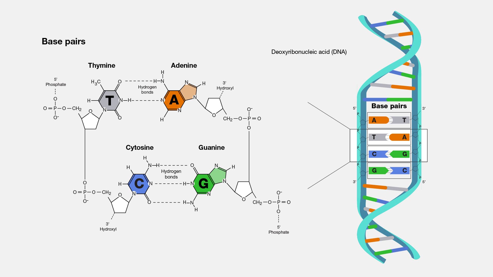 There are four bases—adenine, thymine, cytosine, and guanine—which keep the two strands of DNA connected via chemical bonds between them. Connections between thymine and adenine require two hydrogen bonds, while those between cytosine and guanine need three hydrogen bonds. These differences in bond number prevent non-complementary pairings.