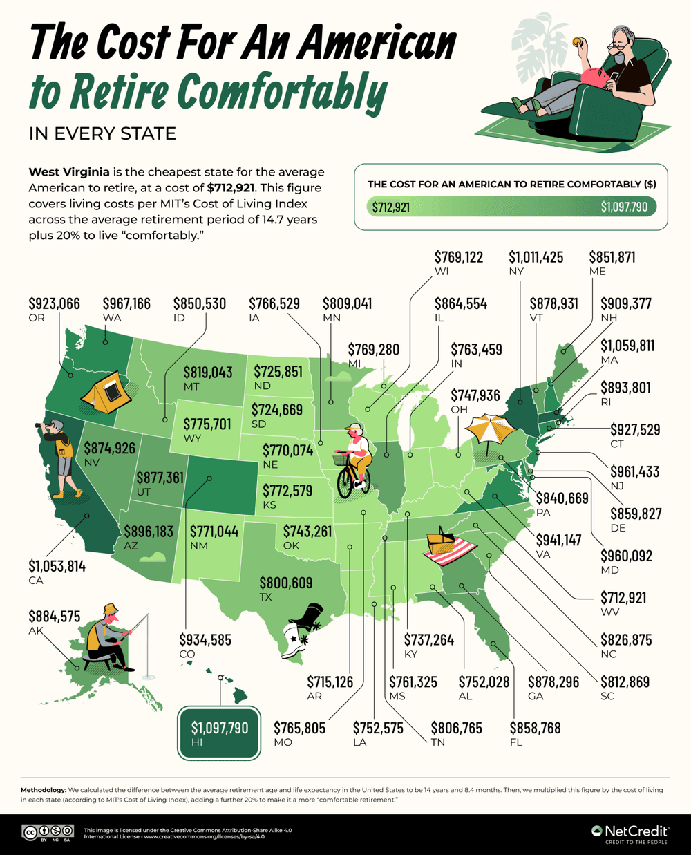 The average American thinks they'll need at least $1.46M to retire comfortably, according to a new study. But the actual floor for a comfortable retirement varies by state. In West Virginia, for instance, the study suggests that retirees only need to have about $712,921 saved for retirement.