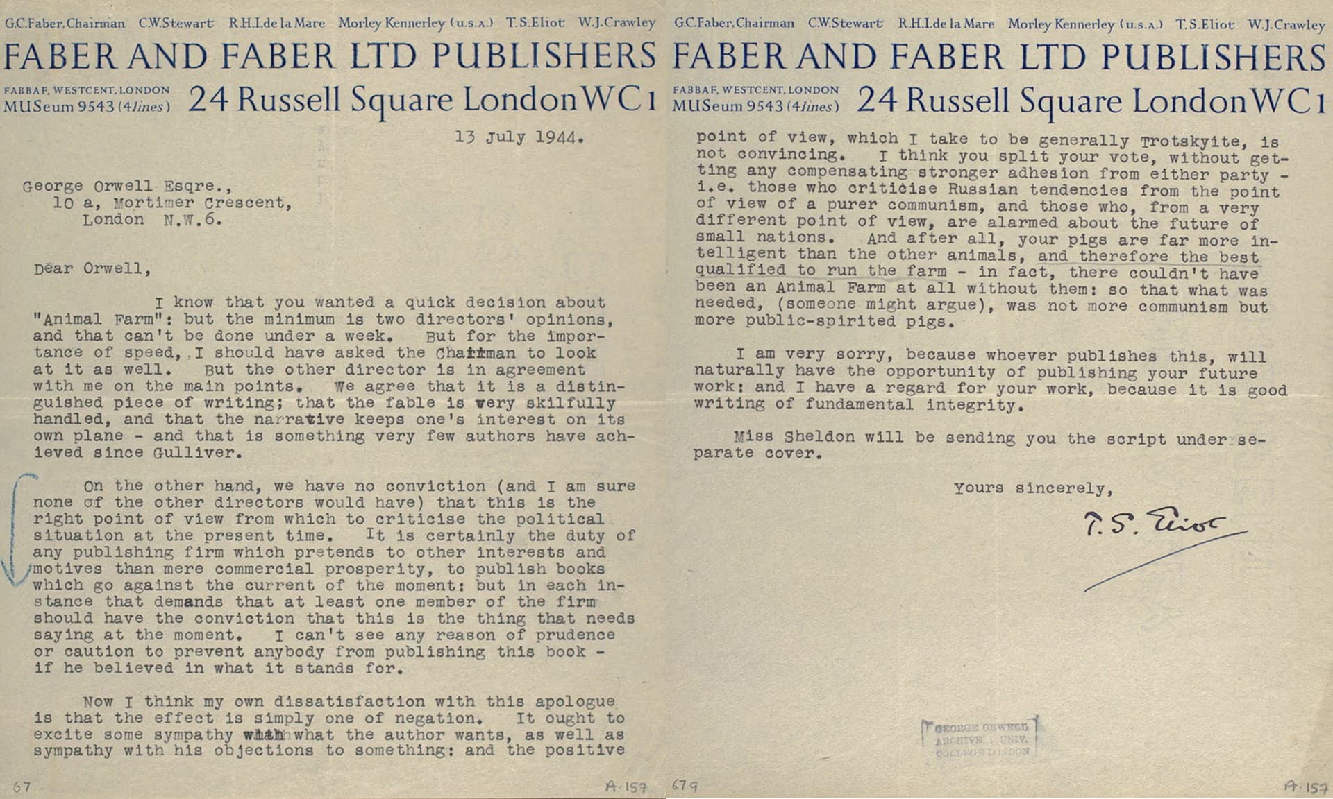 This Brown University Library exhibit displays scans from collector Daniel Leab's extensive trove of Orwell's works, including many first editions and translations. In addition to the beautiful covers, there's also plenty of fascinating bibliographic information.