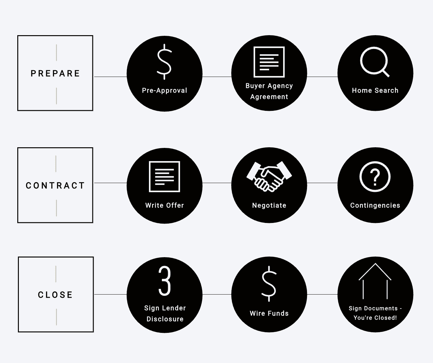 From searching for the home itself to writing an offer letter to closing on the home, there are specific steps involved in becoming a homeowner. This checklist from a Tennessee real estate broker provides a visual outlining the basic steps of the process.