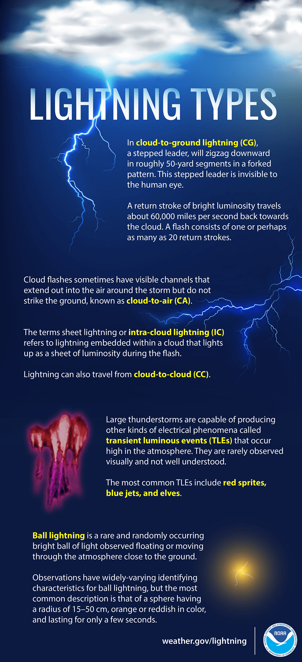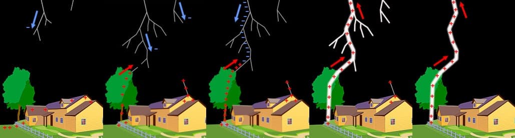 While most lightning occurs within or between clouds, the potential can induce a net positive charge on Earth's surface below. If a filament of descending, negatively charged air meets a tendril of positively charged particles rising from the surface, cloud-to-ground lightning is produced. Tall objects such as trees and buildings facilitate this meeting, making them more prone to lightning strikes. Although associated with thunderstorms, the charge separation driving the 8 million lightning strikes that occur on Earth daily can occur during other extreme weather events (e.g., hurricanes, blizzards) and volcanic eruptions.