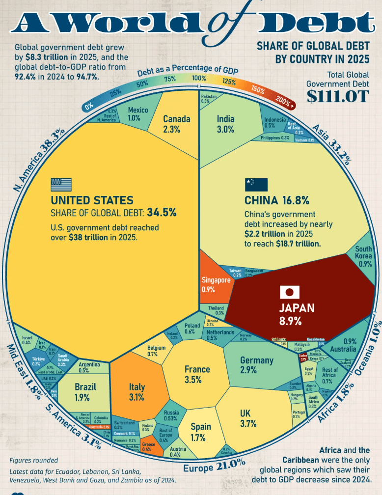 The United States accounts for roughly 34.5% of that debt, while China accounts for about 16.8%.