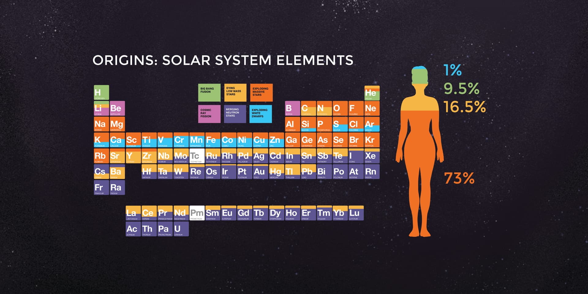 Nearly all elements found in the periodic table were formed through nuclear fusion within stars, collisions between neutron stars, or stars undergoing supernova. All of the oxygen in the our bodies (65% of our mass) comes from exploding massive stars.
