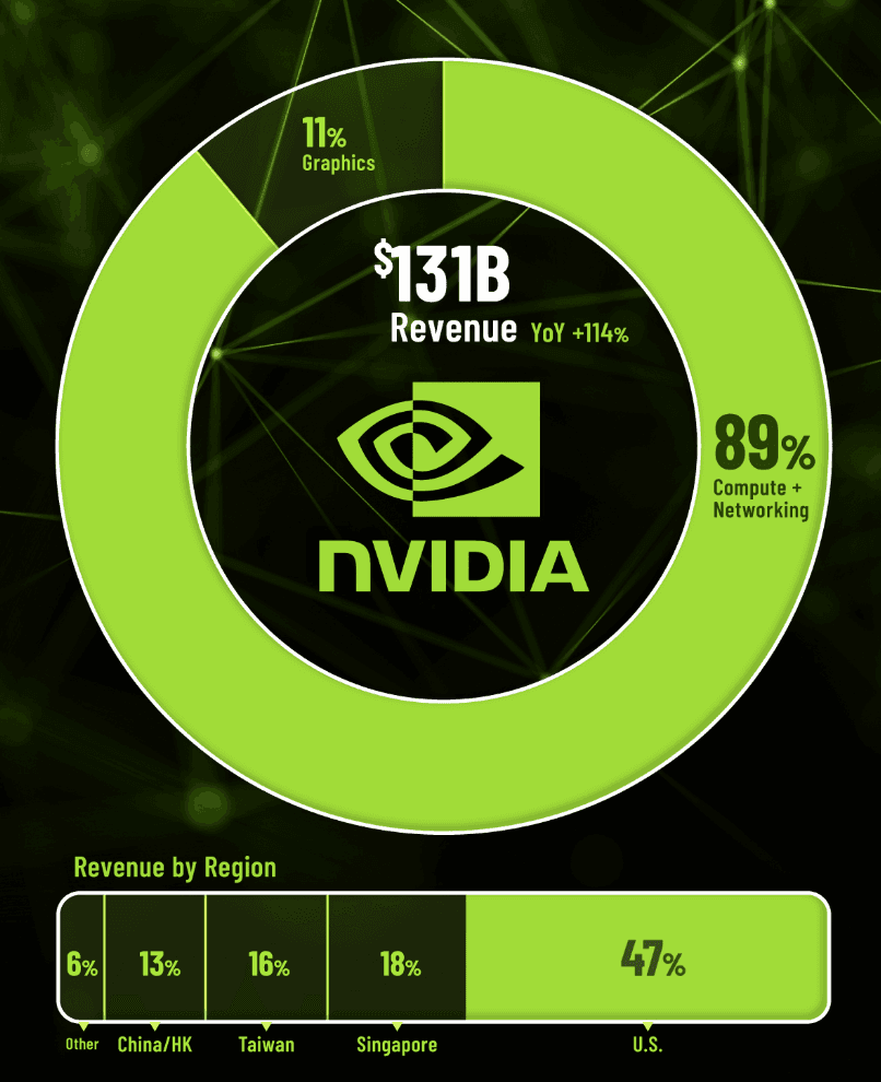 This chart breaks down where Nvidia’s revenue comes from—both in terms of which business segments it’s generated by and in which countries. Most of Nvidia’s revenue stems from its computing segment, which includes billions spent by companies building AI.