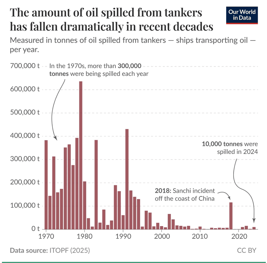 Oil spills from oil tankers—which can have a sharp, short-term impact on oil prices—have become increasingly rare over the decades in part because of stricter regulations.