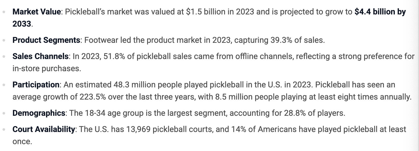 In 2023, the global pickleball market was $1.5B. By 2023, it's expected to grow by a compound annual growth rate of 11.3%.