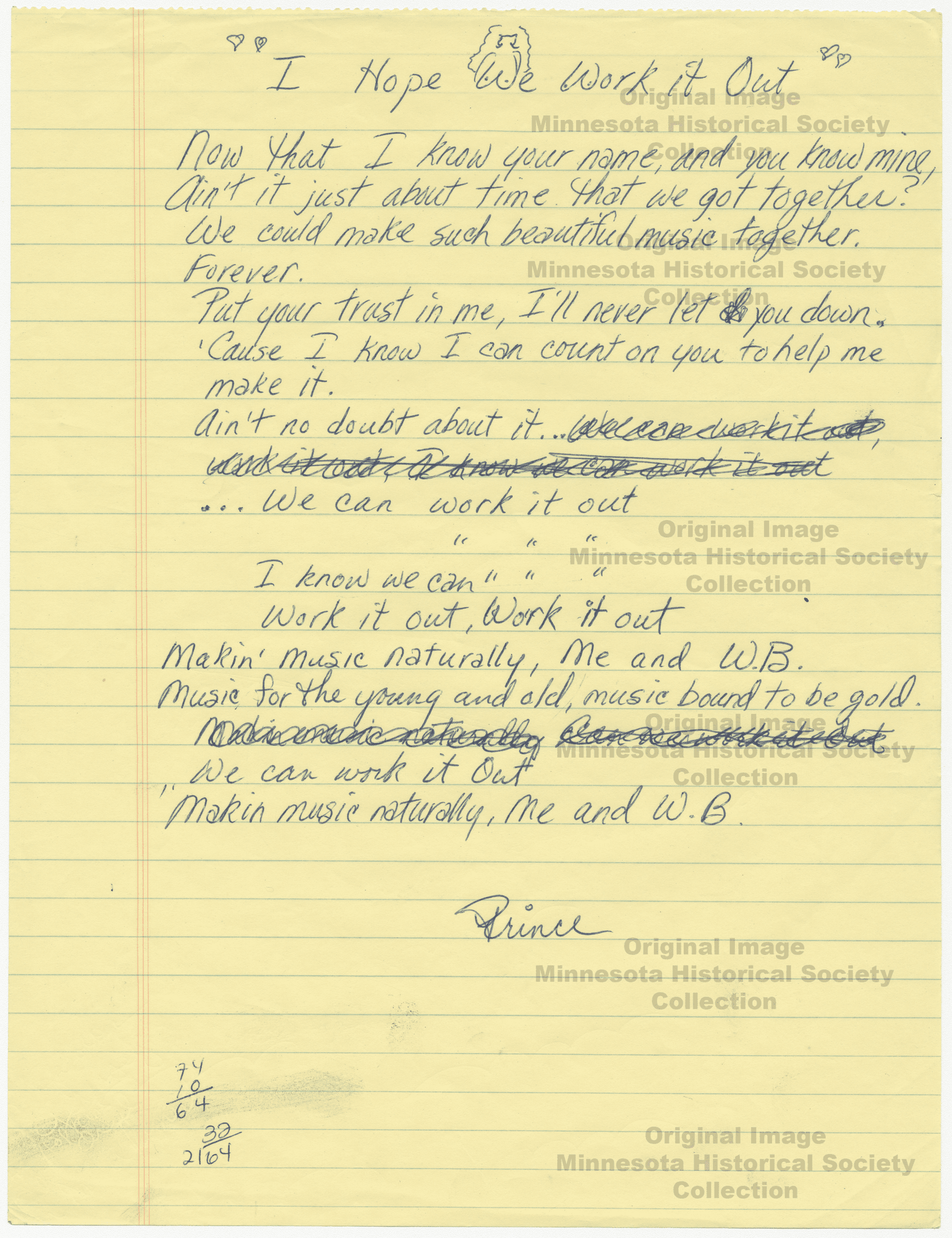 The label scooped the young artist in 1977, eager to ink a deal with the promising young savant. In response, Prince wrote a song called "I Hope We Can Work It Out," which suggested together they'd make "Music for the young and old, music bound to be gold." An official recording of the song was never released, but the Minnesota Historical Society acquired the original handwritten lyrics in 2017. You can see them below.
