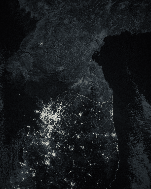 You can tell a lot about a place by looking at satellite imagery of the earth at night. Economists use such images to study poverty and inequality, especially about secretive countries where it can be difficult to get information any other way. An image from NASA’s Earth Observatory shows the difference in electrification between North and South Korea (and the lights illuminating the DMZ are visible from space).