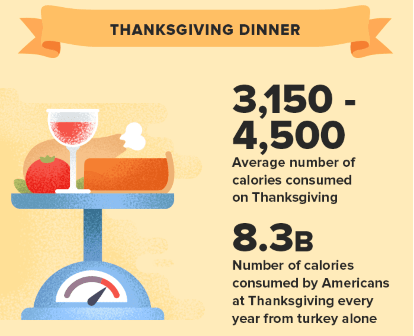 Individuals consume an average of 3,150 to 4,500 calories at the meal, which takes the average male 10 hours to burn off.