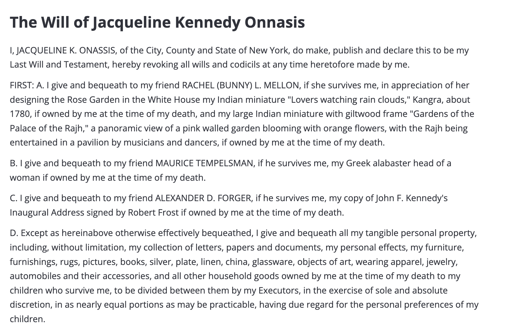 Unlike trusts, the contents of a will are public information. Former first lady Jacqueline Kennedy’s will included her copy of John F. Kennedy's Inaugural Address signed by Robert Frost and other fascinating historic objects.