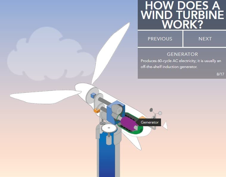 Wind turbines contain a gearbox that increases the rotation of the blades by a factor of 100 from low to high-speed shafts. The latter moves magnets that change the magnetic field within a generator, creating electricity.